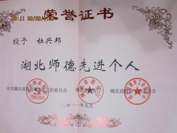 2011年9月6日上午,湖北省教育工会在洪山礼堂召开“庆祝教师节暨第三届湖北师德标兵表彰大会”。省委常委、省总工会主席张昌尔出席大会并作重要讲话。省总工会常务副主席黄国庆主持大会。省高校工委副书记严学军、省总工会副主席何忠琦、省教育工会主席马建才出席颁奖仪式。获奖教师代表宜昌长阳花坪小学刘发英、湖北中医药大学董梦久等先后介绍先进事迹。我校第三临床学院杜兴邦老师荣获“湖北省师德先进个人”称号。这是我校首次获得此类荣誉。