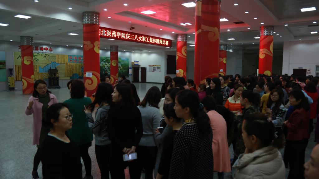 3月7日下午,校妇委会在学子会馆二楼大厅举办了“集体跳绳”比赛活动,湖北医药学院党委常委、副校长李云霞,校工会常务副主席马兴国出席了活动,学校200多位女职工参加了比赛。比赛在欢快的氛围中有序展开,整个赛场气氛和谐融洽,每一位老师充满了活力与热情,脸上挂满了笑容。在比赛过程中女教师们跳出了自我,跳出了风采,更跳出了水平。最终经过激烈的角逐,图书馆第一代表队以三分钟196个的总成绩获得本次比赛第一名。