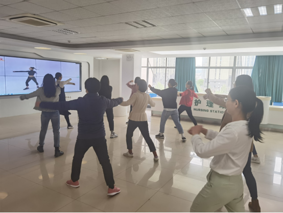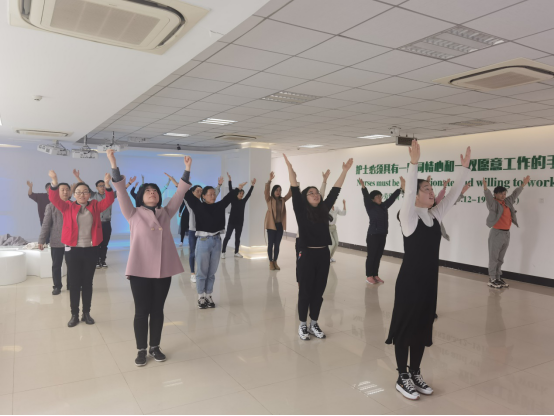 本网讯(通讯员 桂程君)4月13日上午九点半,护理学院三楼护理站旁的空地上,护理学院的老师们随着第九套广播体操的节律舒展着身体的各个部位,两遍广播操做下来,虽然用时只有八分钟,但老师们都微微冒汗了,大家都觉得身体顿时畅快了许多。老师们感叹,大家一起做操的感觉真好,仿佛回到了中学时代,身体内蛰伏的活力也被激发出来了,坐在办公室伏案工作的劳累也得到了缓解。