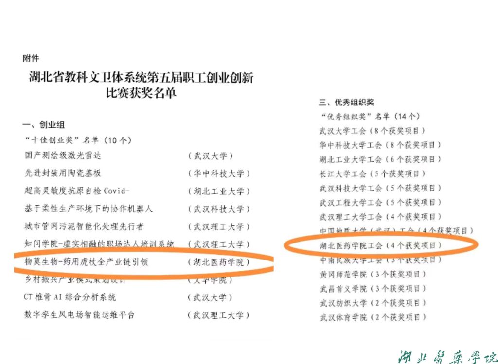 (通讯员 魏燕)近日,湖北省教科文卫体系统第五届职工创业创新比赛暨湖北省“工友杯”职工创业创新大赛21赛区比赛成绩揭晓,全省共表彰68个项目,我校四名职工“双创”项目获得省级表彰,获奖数量位列全省高校第七位。我校全科医学院创业导师罗汀老师和基础医学院张勇洪老师带领的“药用虎杖全产业链引领”项目获得湖北省“十佳创业奖”、招生就业工作处、大学生创新创业学院创业导师冯林老师的“杜若生物—纯天然护肤”项目和李海涛老师的“基层远程智能影像诊断服务”项目获得“优秀创业奖”。基础医学院李健教授团队项目“疟疾耐药性快速检测试剂盒开发”获得“优秀创新奖”。我校及武大、华科等14所高校获得“优秀组织奖”。在此次比赛中,我校首次荣膺省级十佳项目奖,获得省级表彰项目为历年最多,创造了我校在此项赛事上的历史性突破。