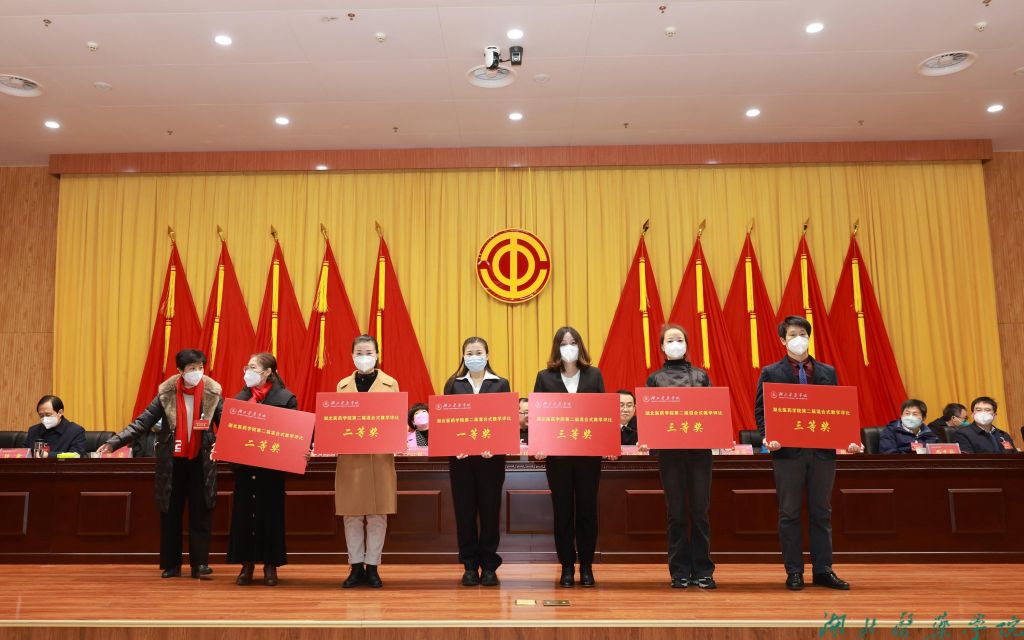 党委常委、副校长严世荣为第二届校级混合式教学奖获得者:一等奖向红,二等奖徐江华、王红梅,三等奖李亚、吴亚婷、王锋斌颁奖。