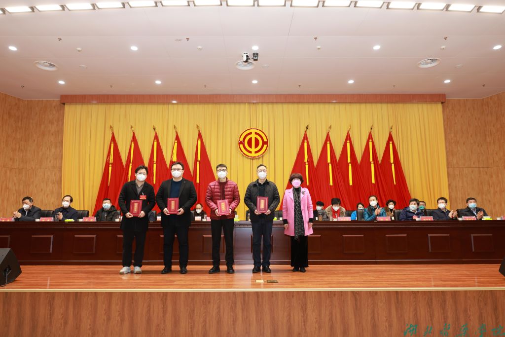 党委常委、副校长李云霞为湖北省第五届“工友杯”创业创新比赛“优秀创新奖”项目获奖个人李健教授、“优秀创业奖”项目获奖个人冯林老师和李海涛老师、湖北省“十佳创业奖”获奖个人罗汀老师颁奖。