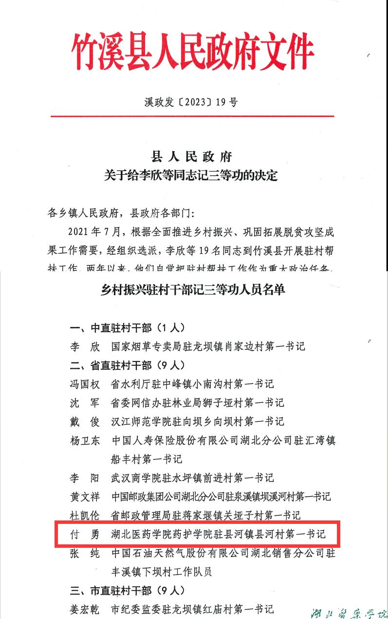 本网讯(文/郑建超)近日,十堰市竹溪县政府下发《关于给李欣等同志记三等功的决定》,对包括湖北医药学院药护学院驻县河镇县河村第一书记付勇在内的19名驻村干部记三等功一次。
