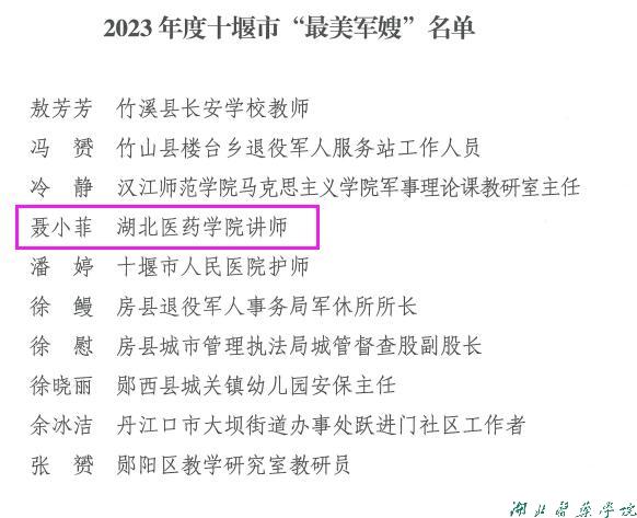 本网讯(通讯员 刘莹)近日,由市委组织部、市委宣传部、市总工会、市妇女联合会等单位联合举办的“最美退役军人”“最美拥军人物”“最美军嫂”等评选活动结果公布,我校聂小菲老师被授予2023年度十堰市“最美军嫂”荣誉称号。