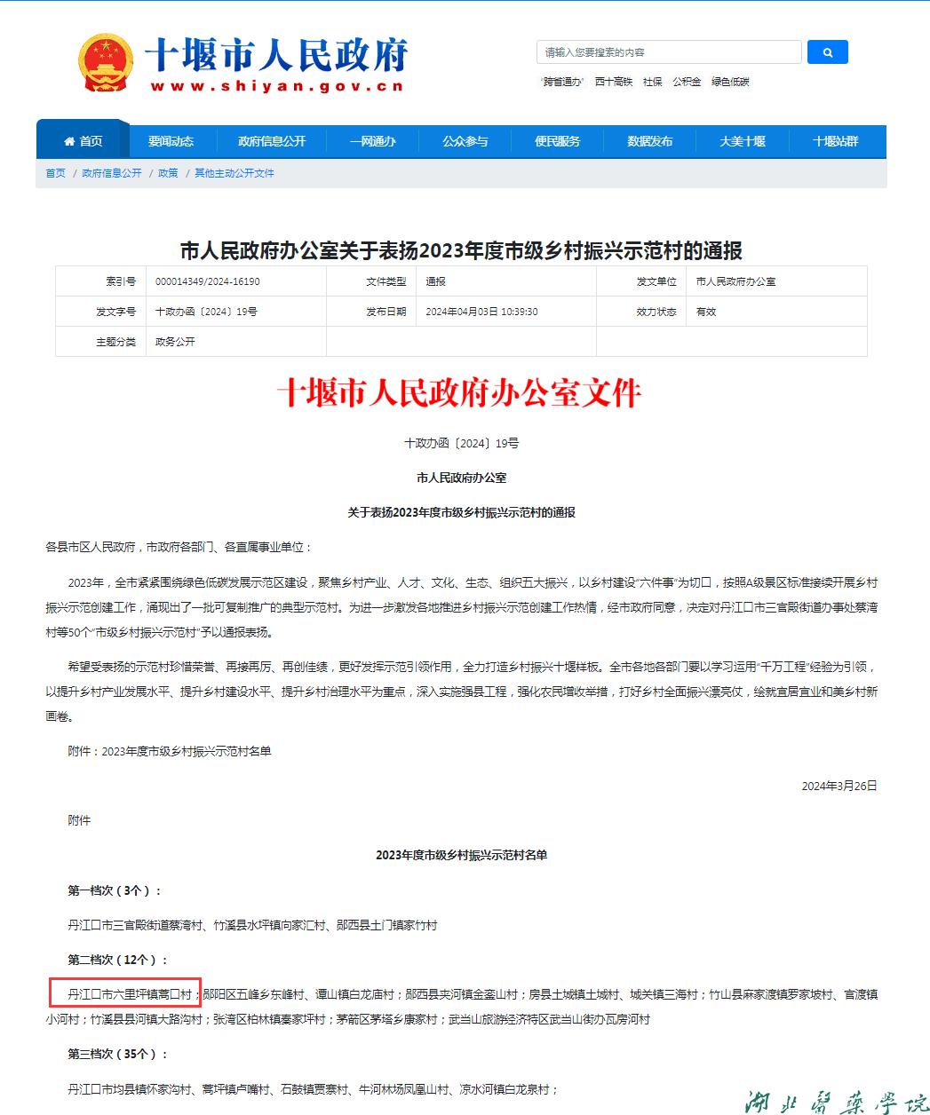 本网讯(通讯员 孙敬龙)4月3日,十堰市人民政府办公室发布《关于表扬2023年度市级乡村振兴示范村的通报》,对50个“市级乡村振兴示范村予以通报表扬”,其中第一档次3个、第二档次12个、第三档次35个,我校定点帮扶的蒿口村位居第二档次。