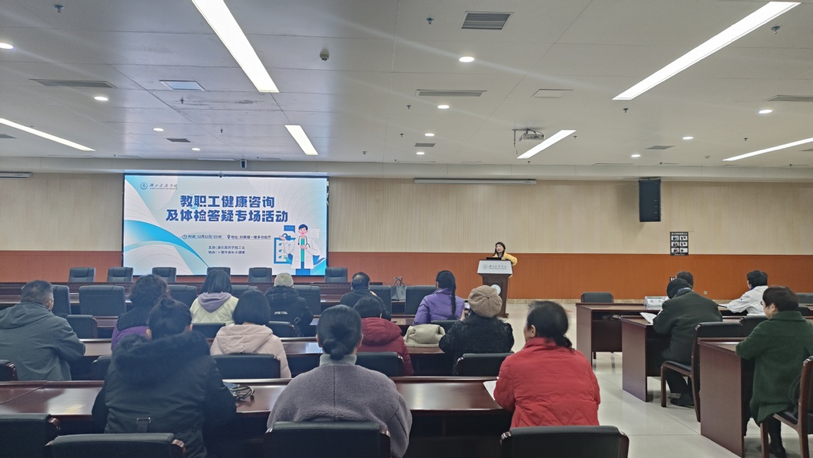 活动分两个阶段有序开展。第一阶段为专家讲座环节,特邀原附属太和医院内分泌科主任医师,现十堰美年大健康体检中心内科医师朱大菊主讲。作为知名糖尿病专家,朱大菊长期深耕内分泌专业临床诊治与教学工作,她结合自身丰富的临床经验,围绕教职工在体检中发现的常见疾病预防、体检指标解读等核心内容展开讲解,用通俗易懂的语言剖析专业知识,让在场教职工受益匪浅。