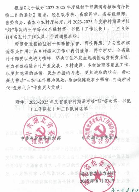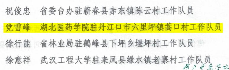 据悉,此次期满考核按23%的比例评选,全省仅有114名驻村工作队员获通报表扬。党雪峰、赵永全两位同志获此荣誉,既是对他们个人扎实工作的充分肯定,也是对我校助力乡村振兴工作的积极鼓励。湖北医药学院及药护学院驻村工作队将珍惜荣誉、再接再厉,持续发挥高校人才和资源优势,扎实做好驻村帮扶工作,为推动乡村全面振兴不断作出新贡献。(审稿 张秋莉)https://www.hbmu.edu.cn/2025/0901/c1050a151890/page.htm我校两名驻村工作队员获省级考核“好”等次通报表扬
